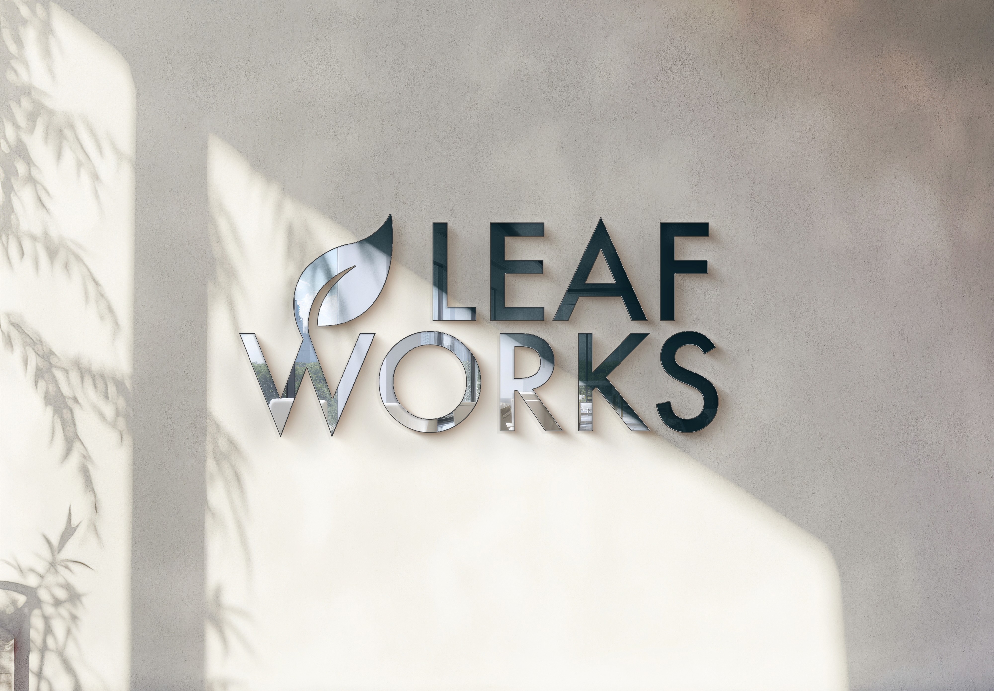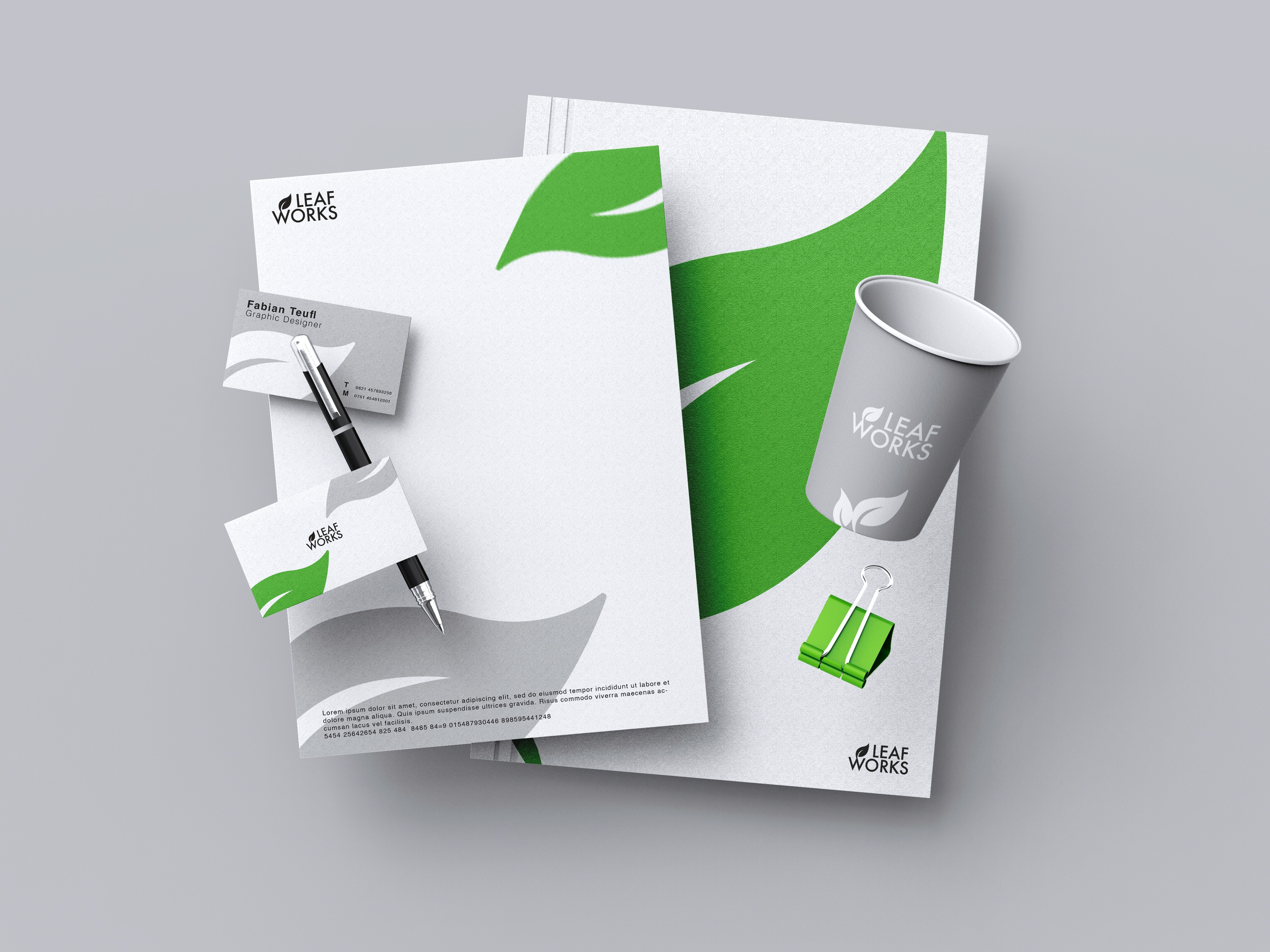 „LeafWorks“ ist ein freies Branding-Konzept für ein nachhaltiges Unternehmen mit Fokus auf Umweltbewusstsein, Designästhetik und moderne Markenkommunikation